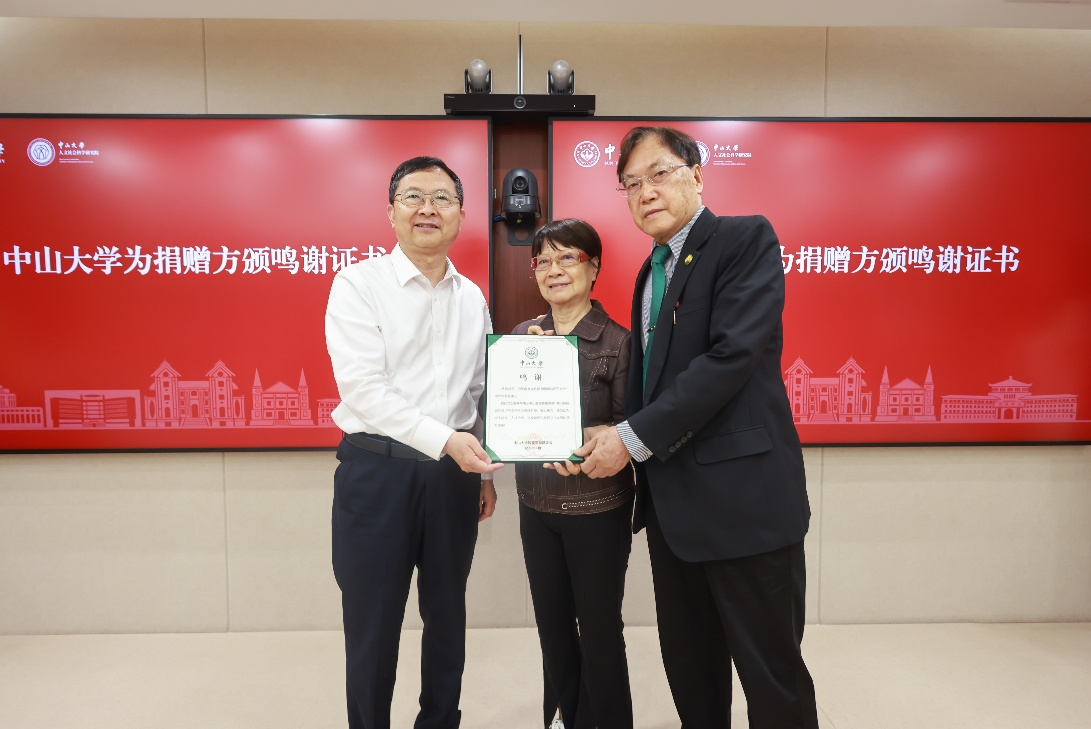 仪式上,陈运河、刘修婉校友向中山大学赠送捐赠支票,高松校长为两位校友颁授鸣谢证书。