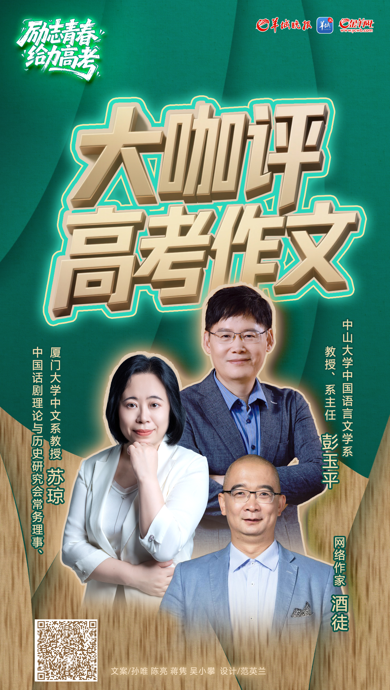 6月7日,高考首日,万众关注的语文作文题揭开神秘面纱,羊城晚报第一时间邀请中山大学中国语言文学系教授、系主任彭玉平,中国话剧理论与历史研究会常务理事、厦门大学中文系教授苏琼,网络作家酒徒,点评高考作文题。