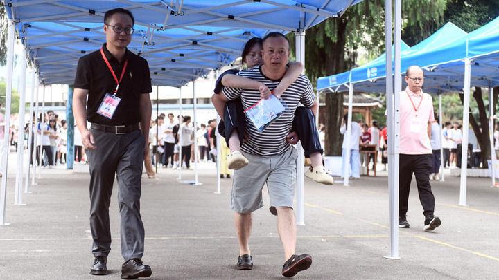 因脊髓炎导致下肢瘫痪的四川资阳考生蒋欣桐,通过绿色通道可提前30分钟进入考场,父亲也被允许在旁协助进出。