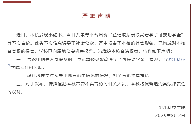 为维护学校合法权益,湛江科技学院发布声明: