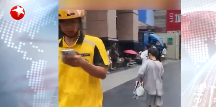 烈日下,一名外卖员骑送餐车到写字楼下,马上有几个十几岁的孩子上前将其围住。外卖员选中一个小孩,扫了对方脖子上挂的收款码,支付一两元钱,小孩迅速接过外卖转身冲向大楼电梯间。