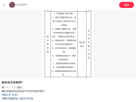 该学院工作人员向记者介绍,该校云端剧本杀学院成立于2024年6月7日,并于去年发布了教师招聘信息,“招聘发布后,报名的人很踊跃,我们目前有18个老师,一周有两节课,近期暂时没有剧本杀老师的招聘计划。” 工作人员表示,重庆移通学院作为本科院校,研究生学历是教师门槛,“在教师招聘方面,我们还是坚持宁缺毋滥,有些非常有经验的剧本杀行业从业者应聘,也需要达到这样一个要求。”