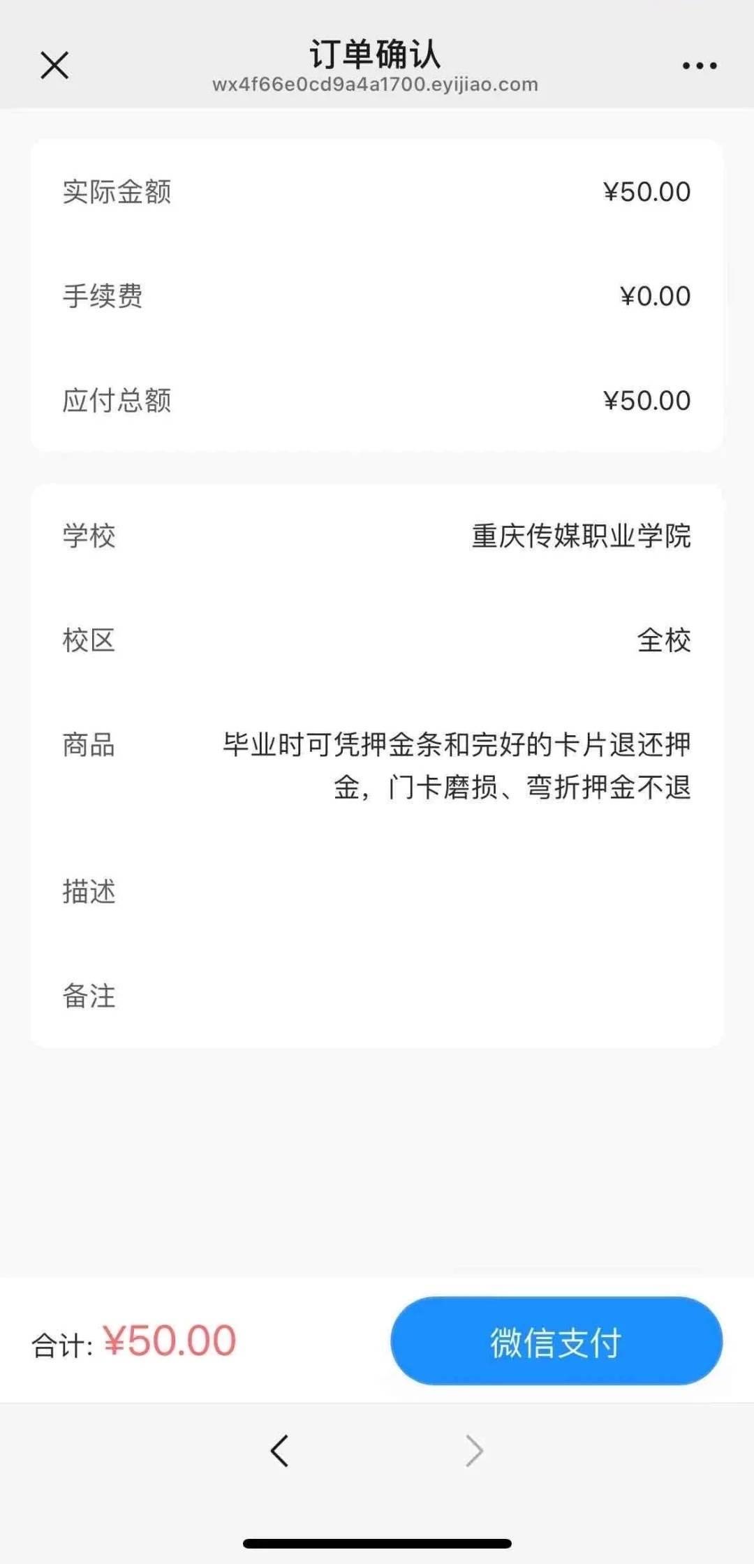 其提供的门禁卡办理订单截图显示,押金为50元,且注明“毕业时可凭押金条和完好的卡片退还押金,门卡磨损、弯折押金不退。”