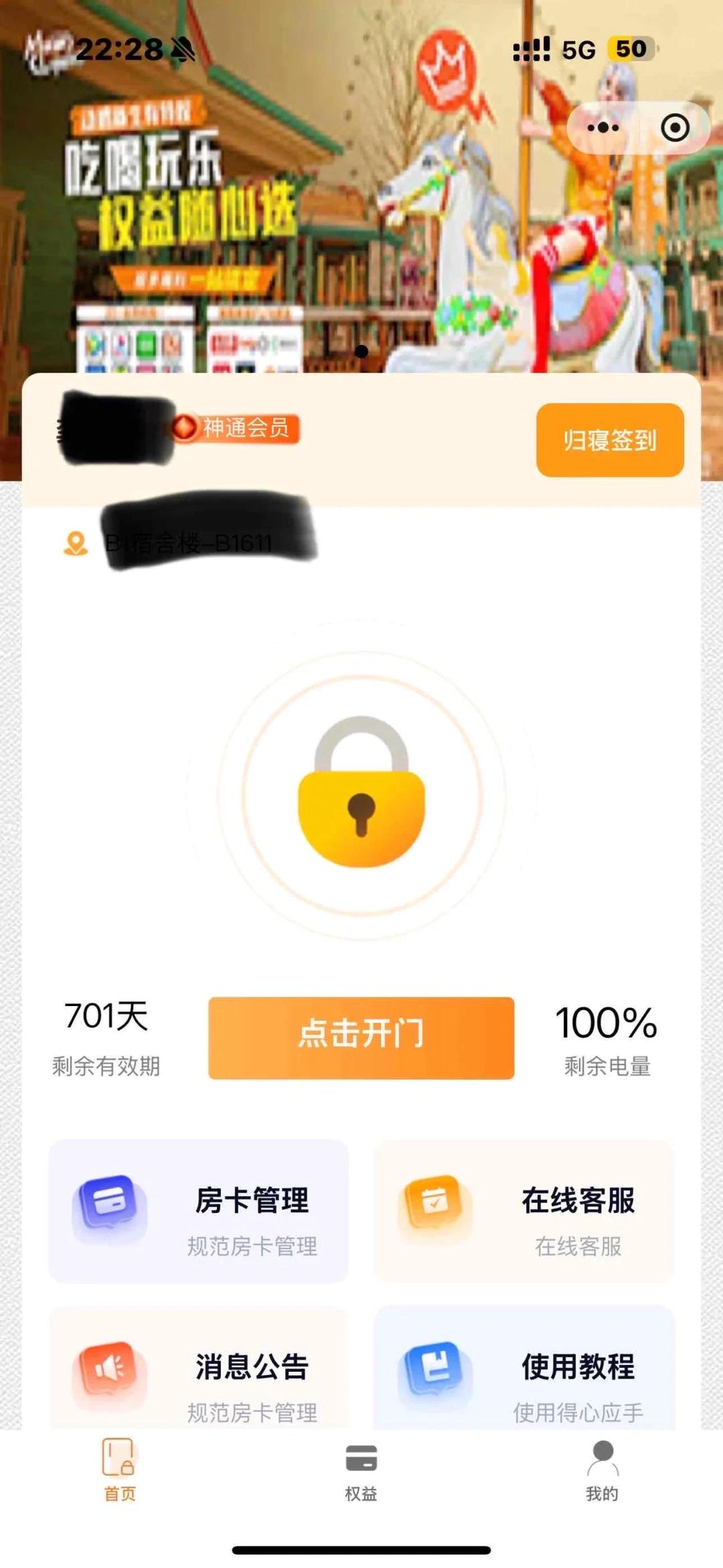 从他提供的微信小程序截图可见,页面中间有一把黄色锁图标,下方标注“点击开门”,左下角则设有“房卡管理栏”。