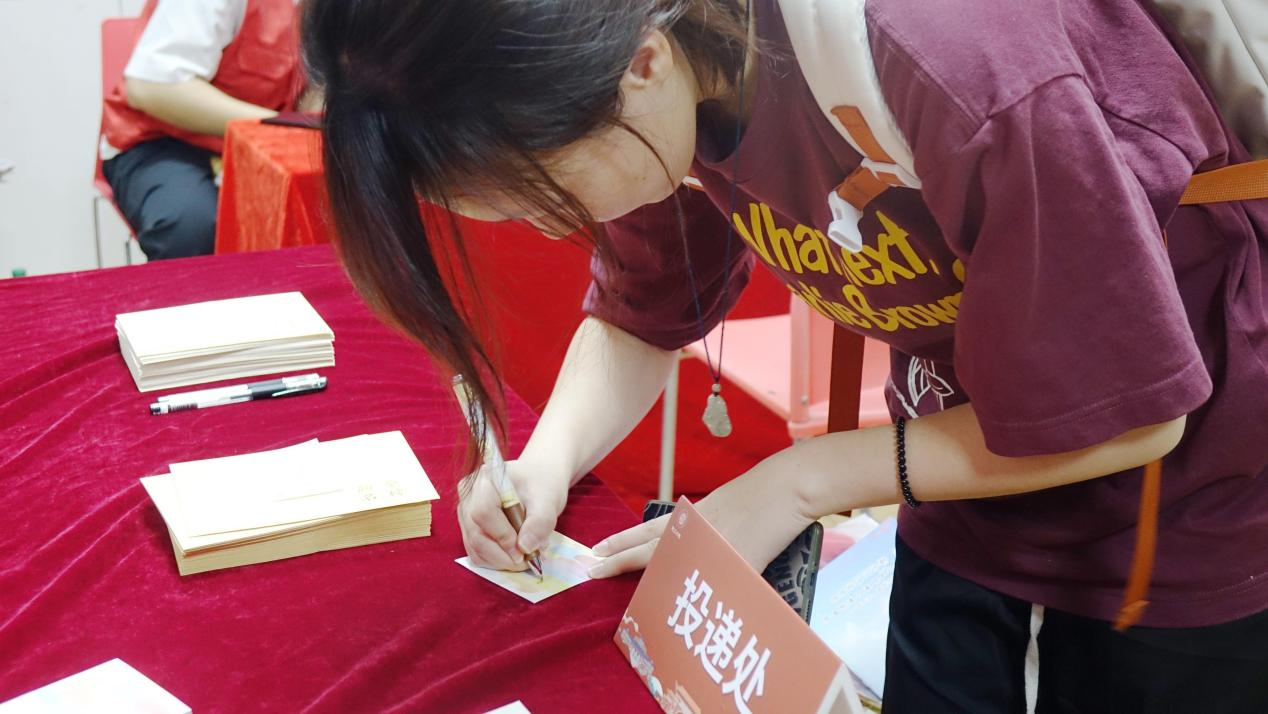 记者看到迎新现场的桌面上摆着便利贴和专属信封,新生可以在便利贴上写下自己对大学生活的期望和祝愿。这些信件将被存入“时光信箱”,在毕业季时重新交还给他们。