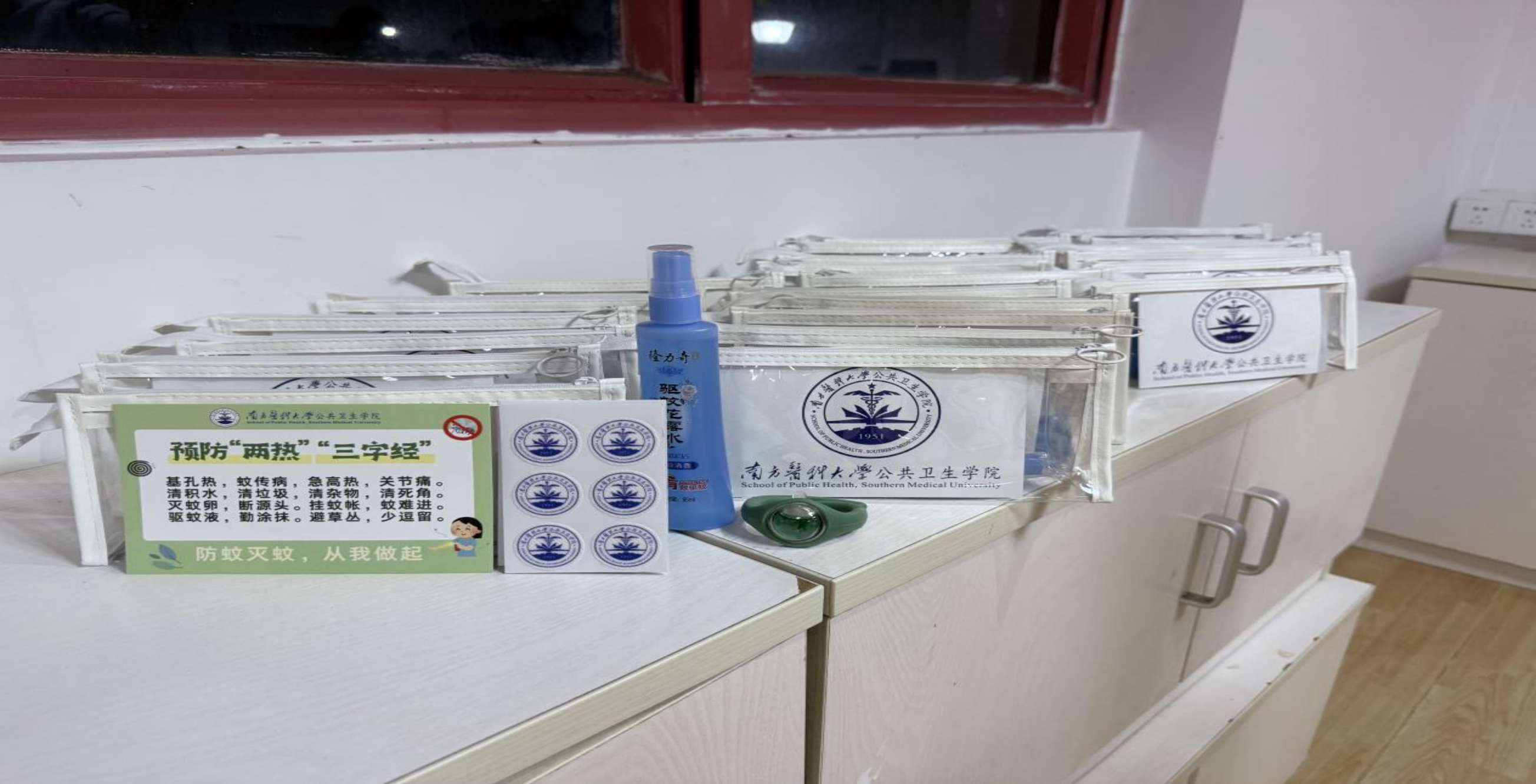 当前处于蚊媒传染病流行季节,为提高新生的健康意识,学院特别为新生准备了“防蚊”礼包,包括防蚊贴、防蚊手环、花露水等实用物品,并附赠了预防“两热”的宣传卡片。