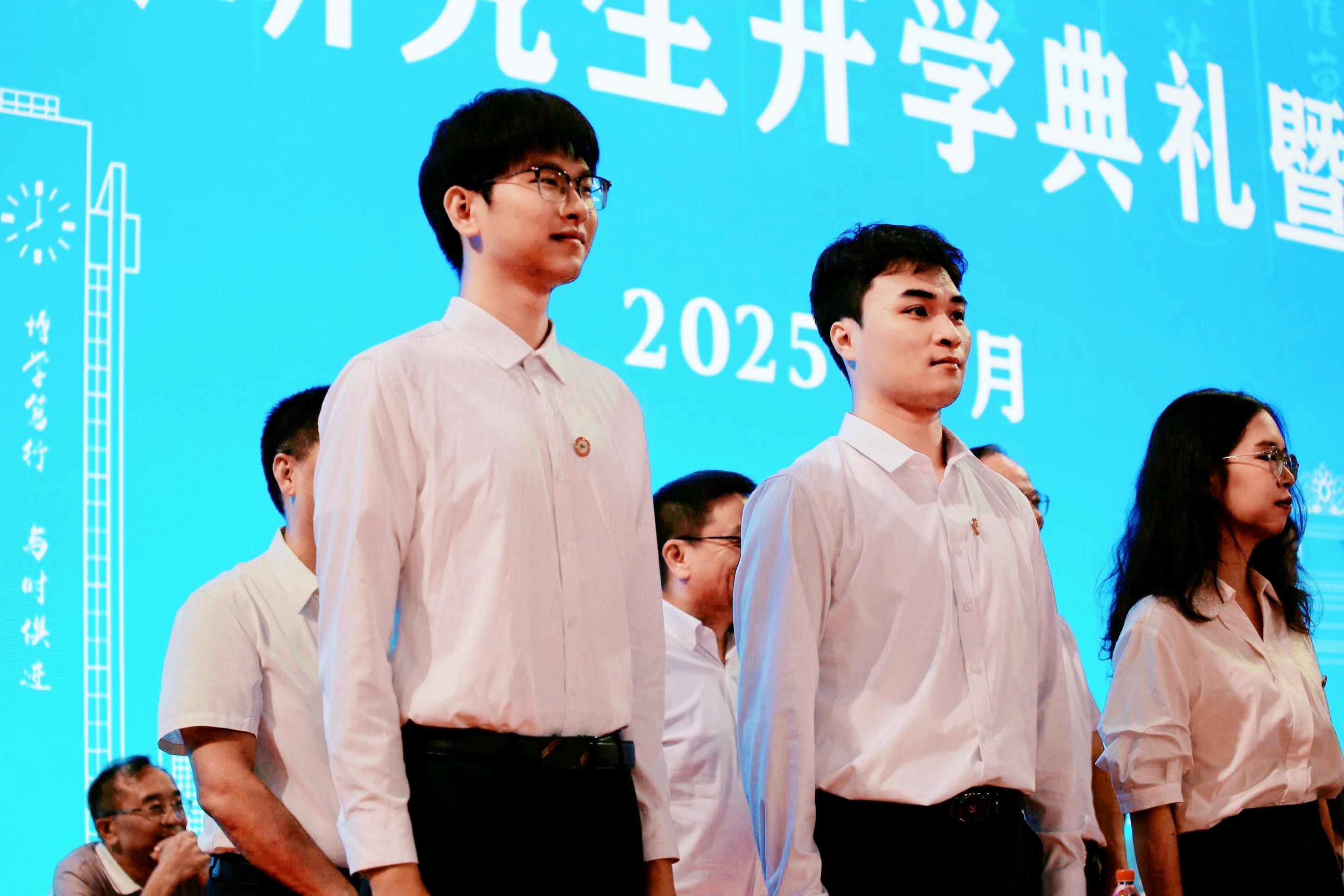 开学典礼上,领导和专家为研究生新生代表佩戴校徽。胸前的校徽承载着“博学笃行,与时俱进”的精神,激励着新生们在未来的学习与生活中,以新时代青年的担当,不断追求卓越,为实现自己的人生价值和社会的进步贡献力量。