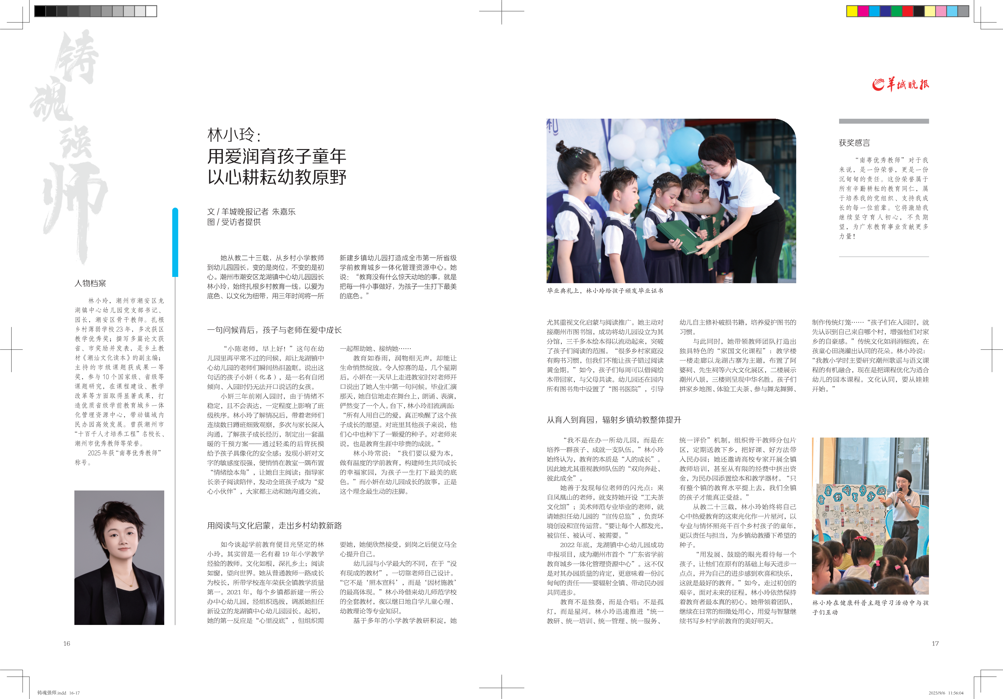 她从教二十三载,从乡村小学教师到幼儿园园长,变的是岗位,不变的是初心。潮州市潮安区龙湖镇中心幼儿园园长林小玲,始终扎根乡村教育一线,以爱为底色、以文化为纽带,用三年时间将一所新建乡镇幼儿园打造成全市第一所省级学前教育城乡一体化管理资源中心。她说:“教育没有什么惊天动地的事,就是把每一件小事做好,为孩子一生打下最美的底色。”