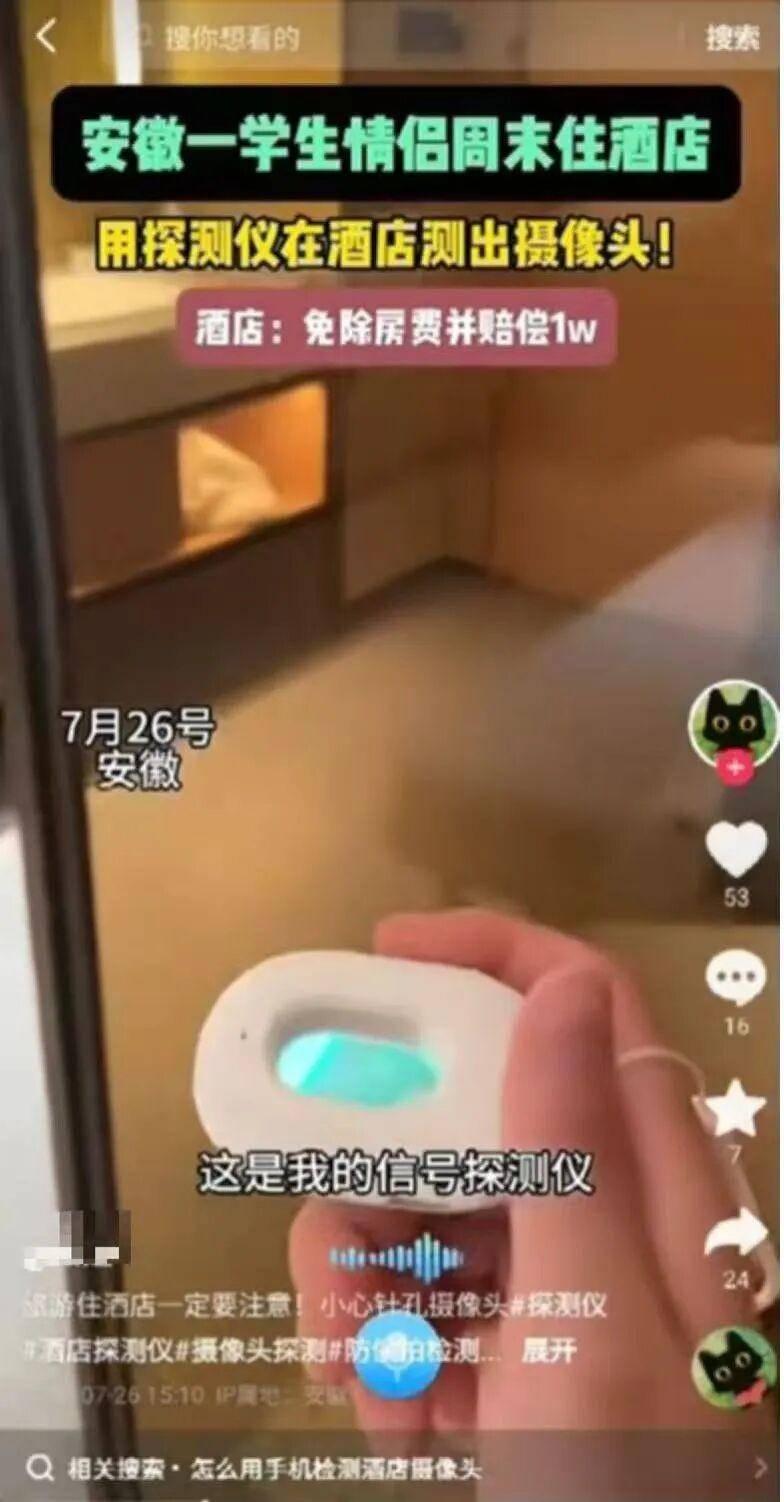 据该视频内容称,安徽一学生情侣在周末期间,到一家酒店度假住宿。但在使用探测仪对酒店房间进行检测时,发现房间内装有摄像头。这对情侣随即报警处理,酒店回应后答应免除房费并赔偿1万元。值得注意的是,该视频同时还在评论区内推荐某品牌探测仪。