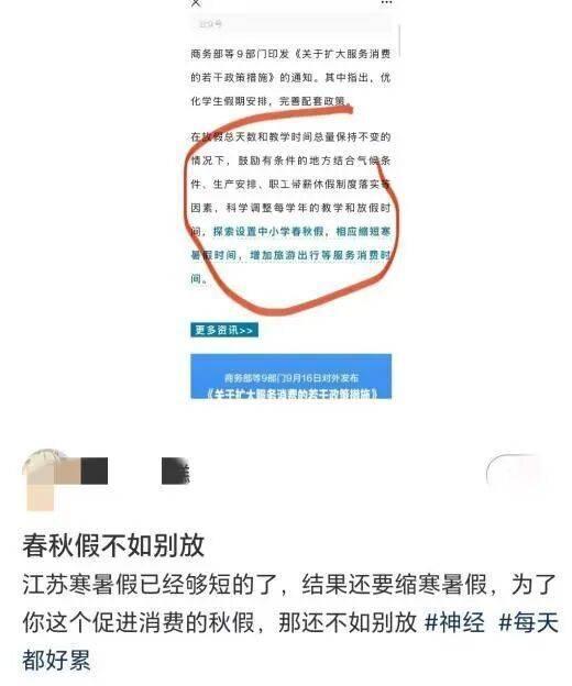 记者注意到,该网友引用的是商务部等九部门印发的《关于扩大服务消费的若干政策措施》通知。其中明确提出:“优化学生假期安排,完善配套政策,科学调整每学年的教学和放假时间,探索设置中小学春秋假,相应缩短寒暑假时间,增加旅游、出行等服务消费的时间。”
