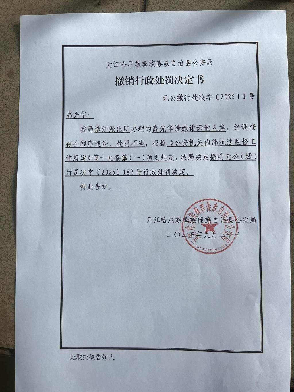 元江县公安局9月20日作出的撤销行政处罚决定书载明:该局澧江派出所办理的高光华涉嫌诽谤他人案,经调查存在程序违法、处罚不当,根据《公安机关内部执法监督工作规定》第十九条第(一)项之规定,决定撤销元公(城)行罚决字〔2025]182号行政处罚决定。