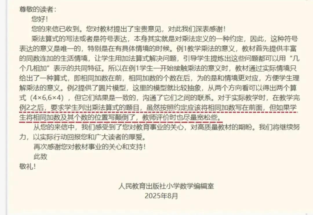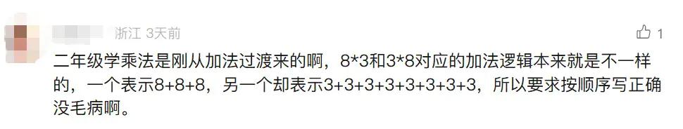 另一位小学数学老师也表示,新学期学乘法后,作业里顺序不对就会判错。