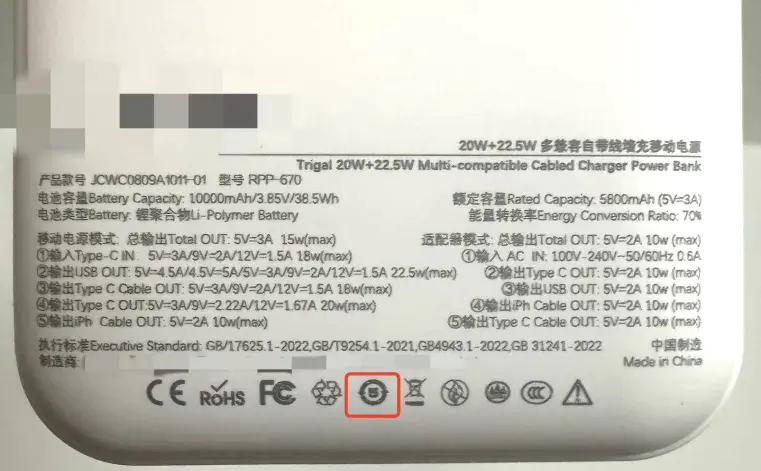在充电宝的一侧,通常有可循环使用标识,中间的数字代表充电宝内电池的可循环使用年限。充电宝作为消耗品,在频繁使用中超过可循环使用年限的话,其内部电池可能会出现异常,将有自燃、爆炸风险。