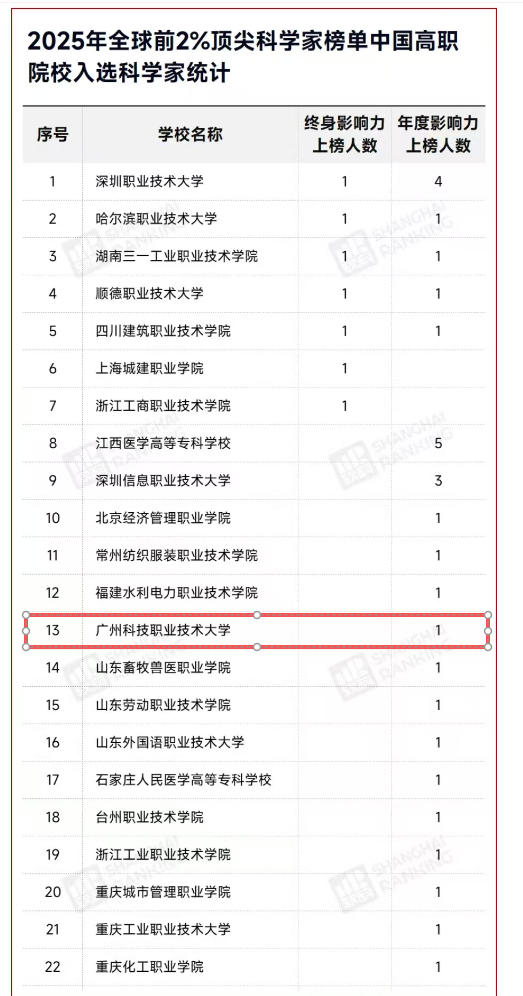 近日,斯坦福大学(Stanford University)和国际权威学术出版社爱思唯尔(Elsevier)共同发布2025年全球前2%顶尖科学家榜单(World's Top 2% Scientists),广州科技职业技术大学(下称:广科大)吴福根教授入选2025年全球前2%顶尖科学家榜单。广科大成为广东省唯一一所获此殊荣的民办职业本科大学。