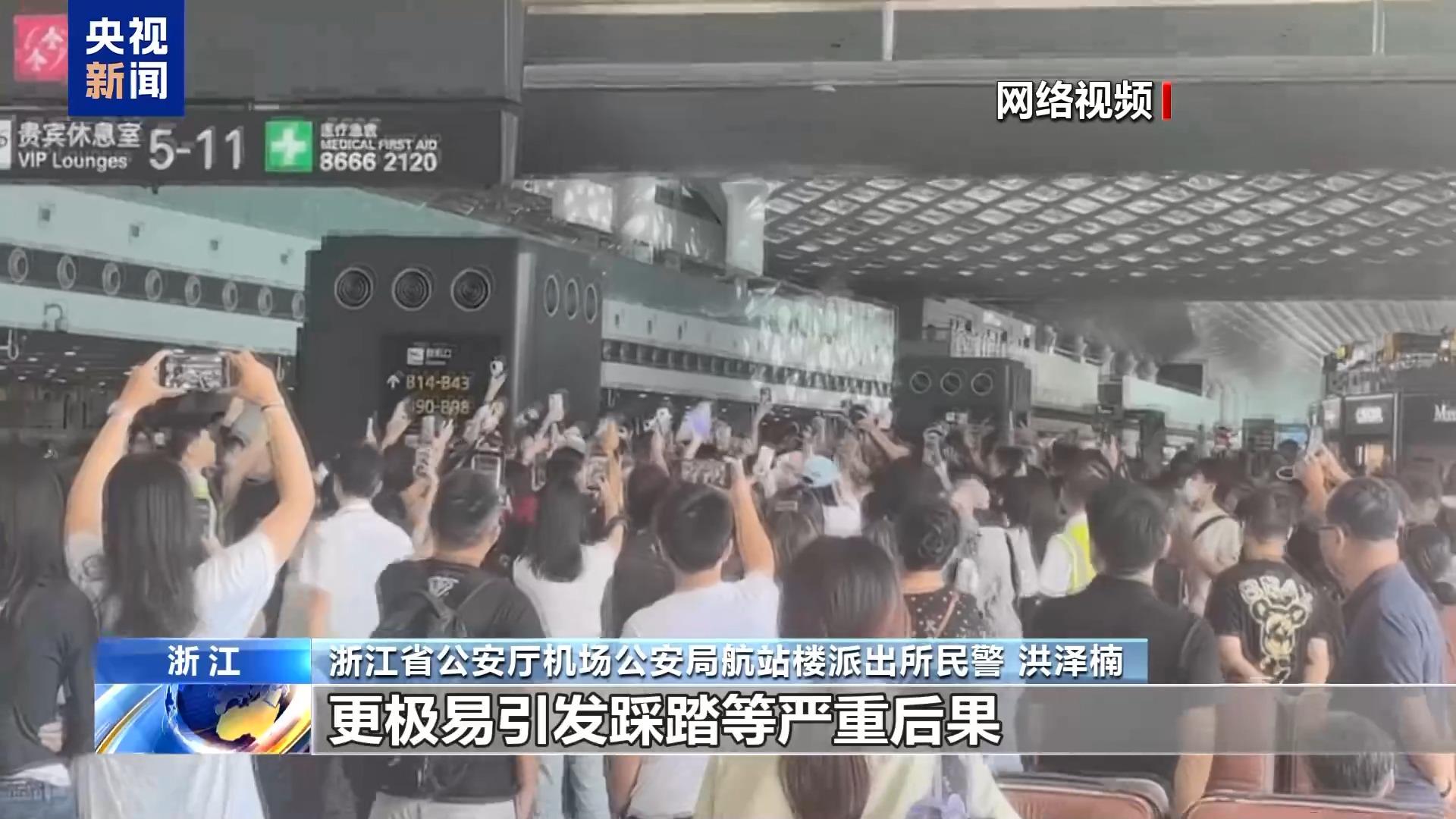 浙江省公安厅机场公安局航站楼派出所民警 洪泽楠:针对此类行为,我们提醒大家,理性文明追星,大家在现场都要配合工作人员的指引,建议粉丝和艺人在公开正确的场合见面。如果出现围堵、强行闯关、追逐艺人车辆等行为,不仅严重干扰他人出行和机场的管理秩序,更极易引发踩踏等严重后果,对于此类违法行为公安机关都将依法追究责任。