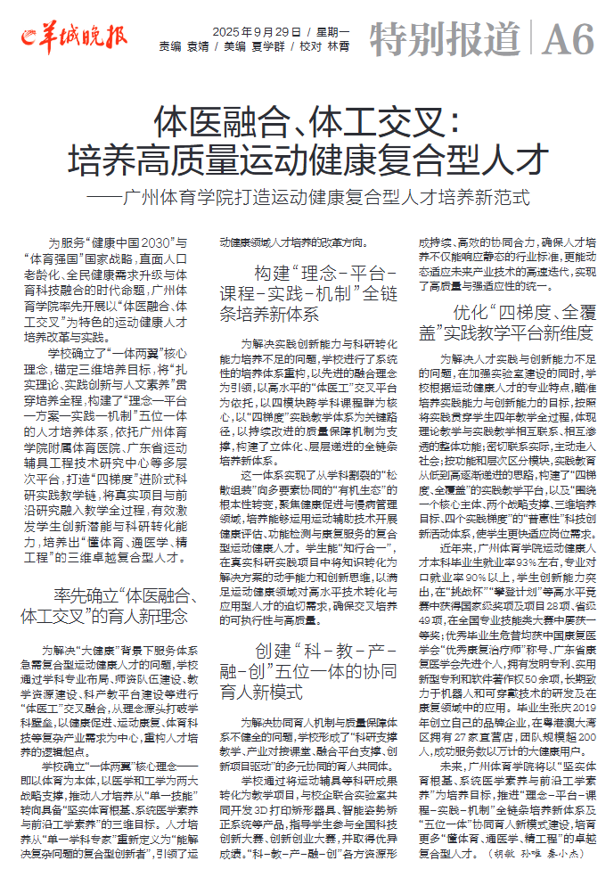 未来,广州体育学院将以“坚实体育根基、系统医学素养与前沿工学素养”为培养目标,推进“理念-平台-课程-实践-机制”全链条培养新体系及“五维一体”协同育人新模式建设,培育更多“懂体育、通医学、精工程”的卓越复合型人才。