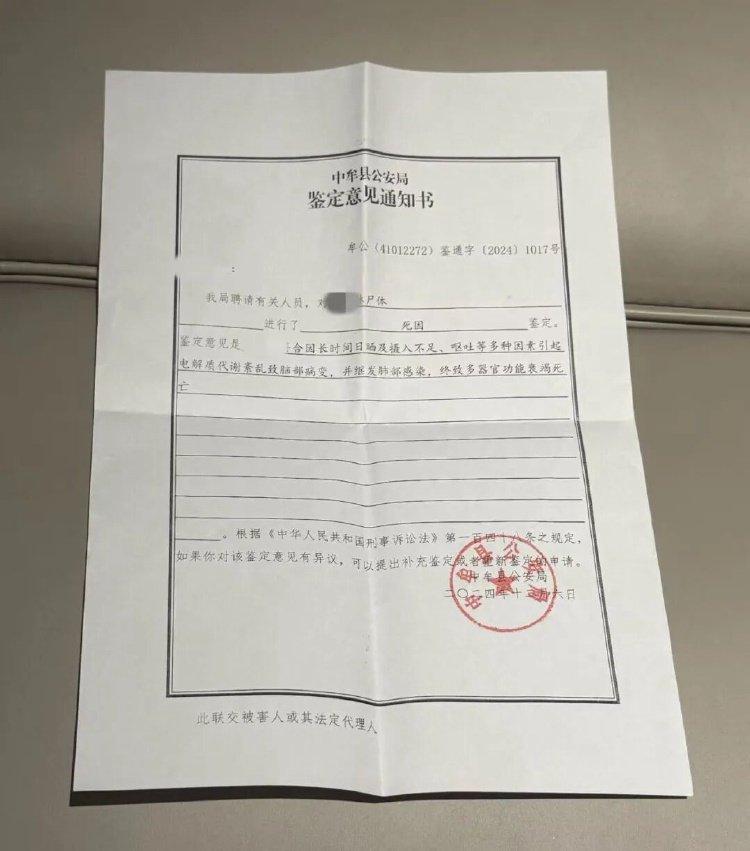 一份当地公安局出具的鉴定意见通知书中记载,“王琳符合因长时间日晒及摄入不足、呕吐等多种因素引起电解质代谢紊乱……终致多器官功能衰竭死亡。”