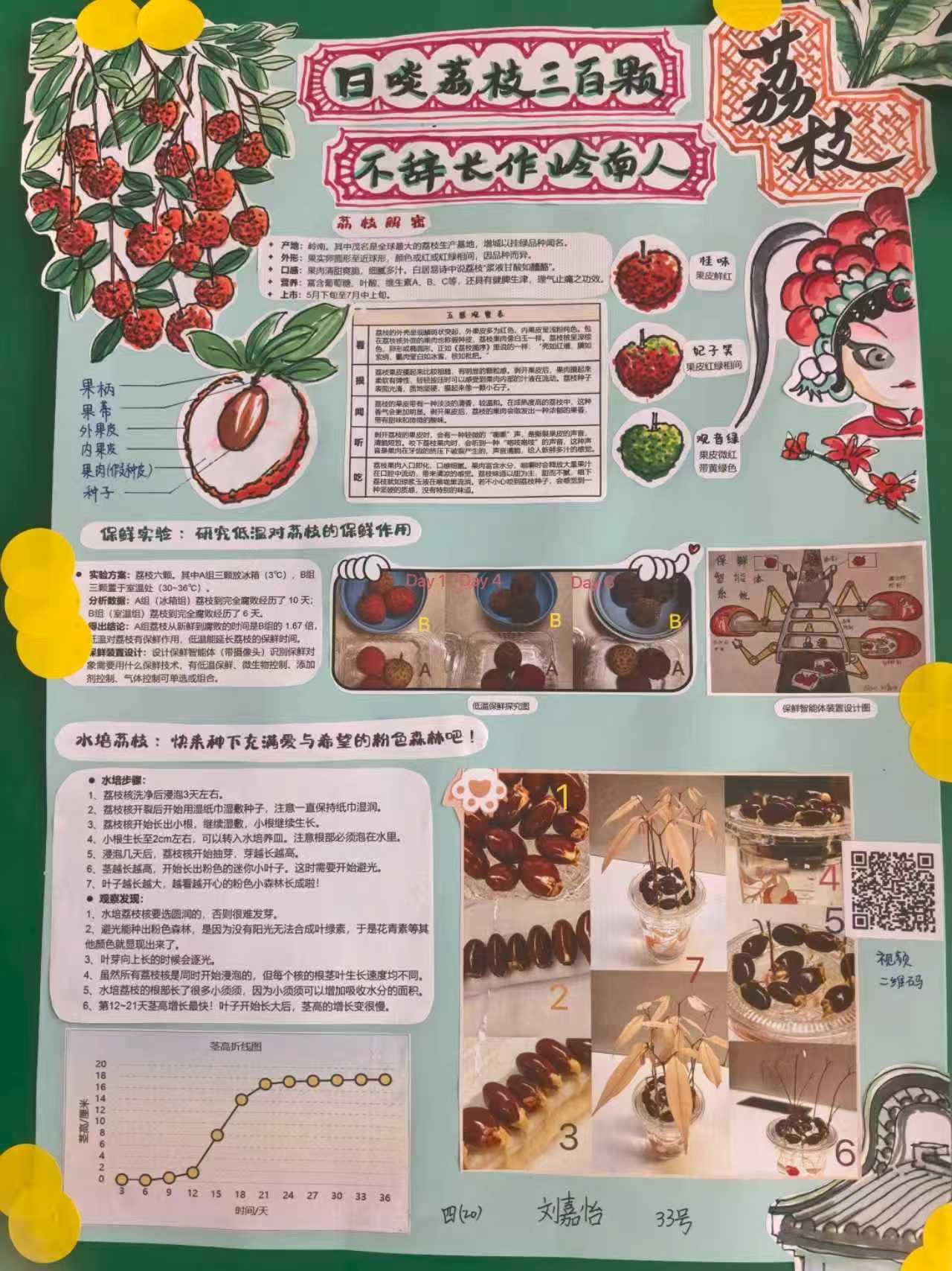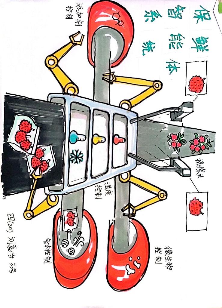 任务四是巧思妙制工程实践,让同学们利用身边材料,制作保鲜装置。有的同学巧用泡沫箱与冰袋,为荔枝打造了“低温魔法小屋”;有的则畅想未来,画出能智能监控的“保鲜机器人”;还有的从生活取材,将外卖盒、保温袋层层组合,为水果穿上实用的“保鲜战甲”。