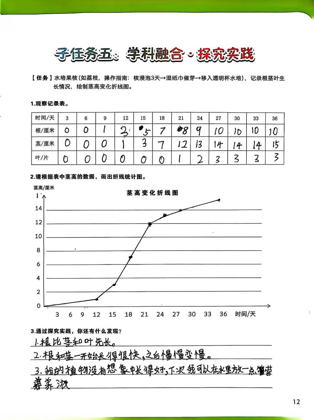 任务五,绘制茎高变化折线图。亲历从种子到幼苗的全过程,系统记录根、茎、叶的生长数据。不仅有数据的统计,这份持续的观察与记录,也在培养孩子们的科学探究能力,潜移默化地塑造耐心、责任心以及对生命的敬畏之情,生命教育与知识学习深度融合。