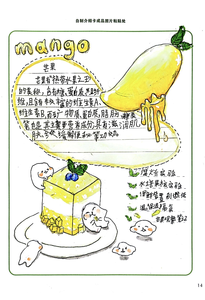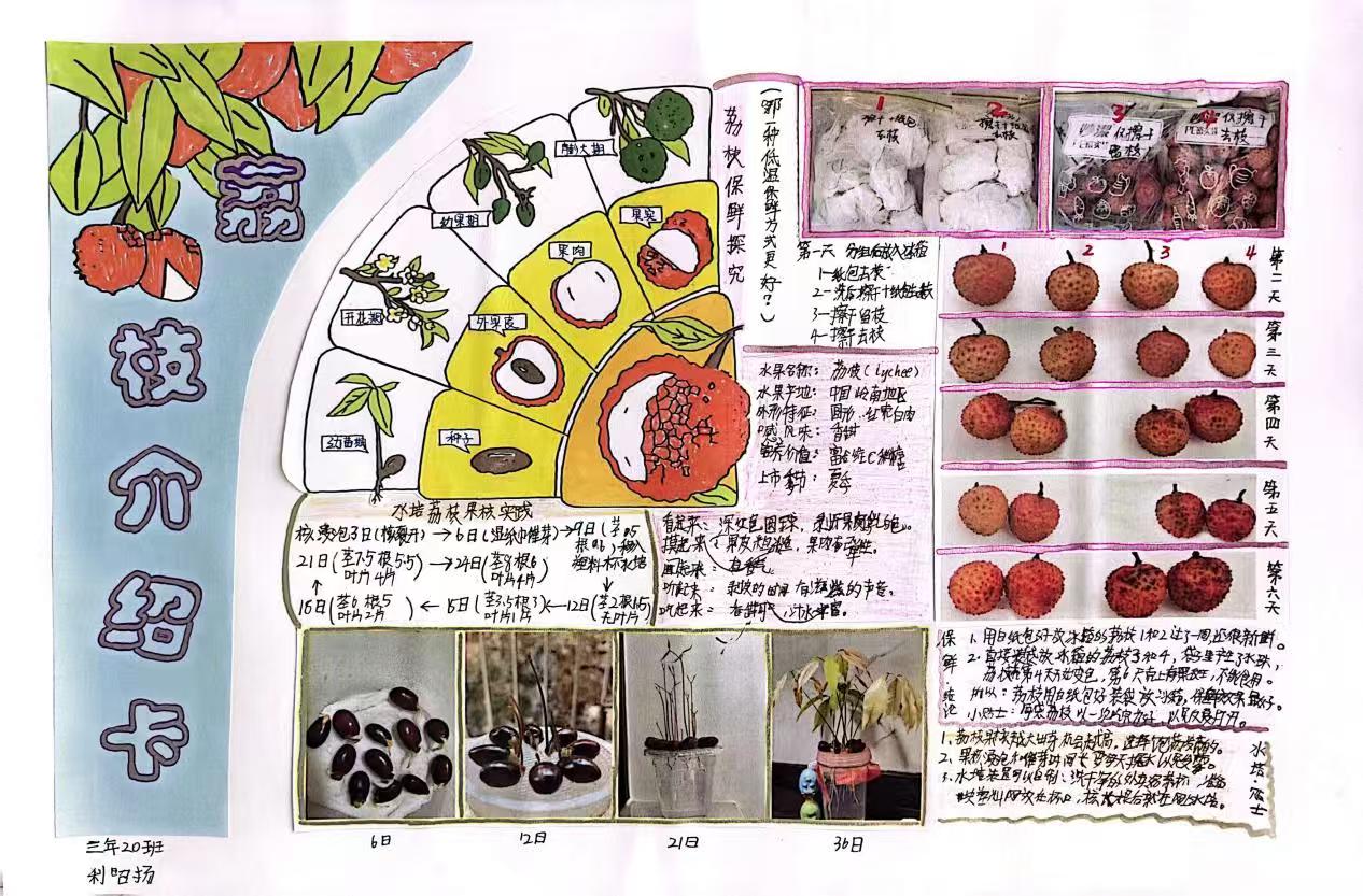 有的孩子轻轻剥开荔枝红褐色的“外衣”,仔细探究果柄、果肉和果核之间的结构,为荔枝搭建起一座清晰的“身体城堡”;有的孩子化身“水果品鉴师”,为糯米糍、妃子笑等不同品种制作“特色名片”;在“芒果探秘”中,“热带水果之王”不再是一个抽象称号,孩子们通过图文并茂的记录和充满趣味的小实验,真正理解了它丰富的营养价值;