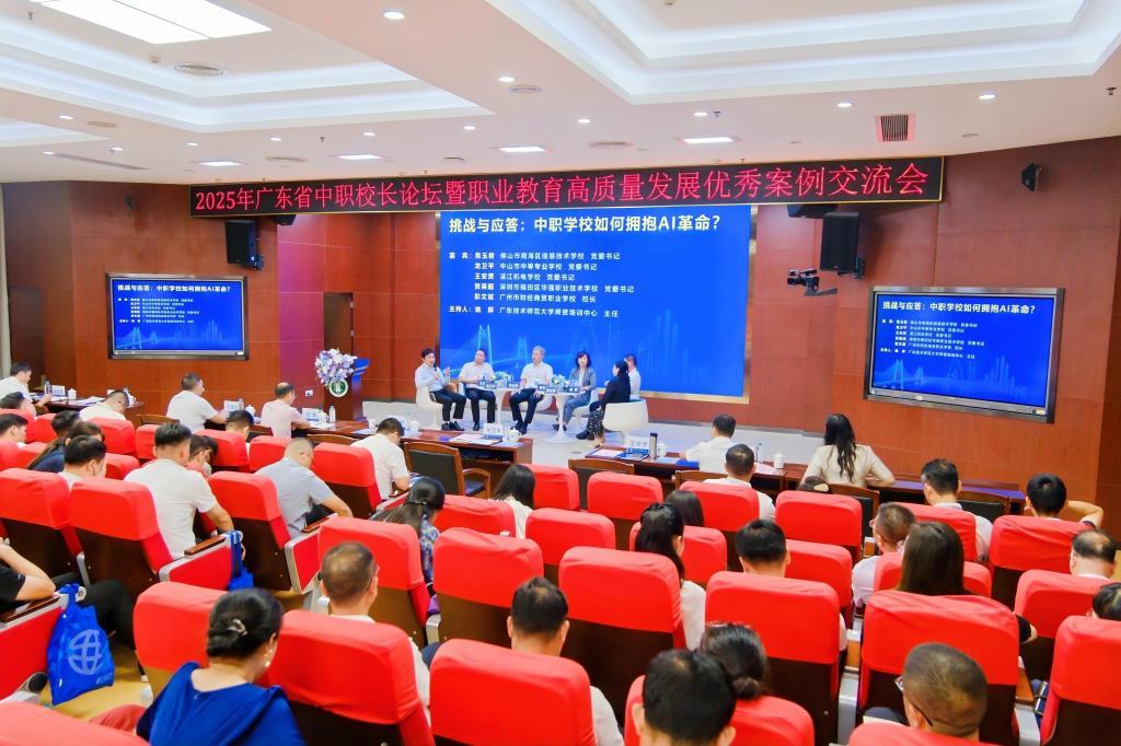 圆桌论坛环节,来自佛山市南海区信息技术学校党委书记焦玉君、中山市中等专业学校党委书记龙卫平、湛江机电学校党委书记王安贤、深圳市福田区华强职业技术学校党委书记贺英超、广州市财经商贸职业学校校长彭文斌,与广东技术师范大学师资培训中心主任姚屏教授围绕“中职学校如何拥抱AI革命”展开深入交流。与会嘉宾分享了各校在应对AI挑战中的实践经验和创新举措,并围绕AI时代师生最应具备的核心能力展开深度对话,为新时代职业教育人才培养提供了有益思路。