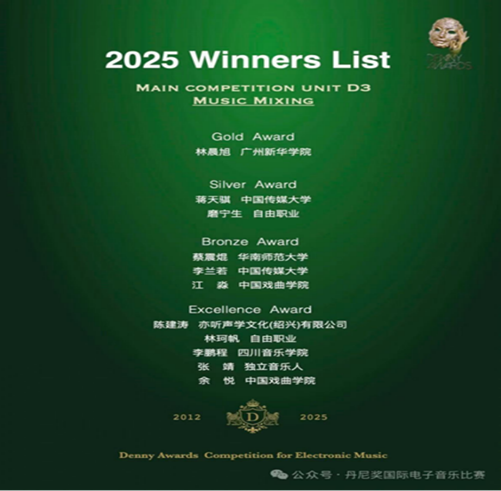 对于林晨旭而言,丹尼奖的金奖不是结束,而是更广阔征程的开始。他说:“这座奖杯提醒我,要永远保持对声音的敬畏和追求。”值得一提的是,林晨旭同学的论文《全景声技术赋能音乐混音:空间音频的革命》已通过审核,拟于2025年10月发表于《音乐鉴赏》杂志,实现了“赛事成果与学术研究”的联动。未来,他计划将赛事经验转化为更多学术成果,继续探索数字音乐与技术融合的边界。