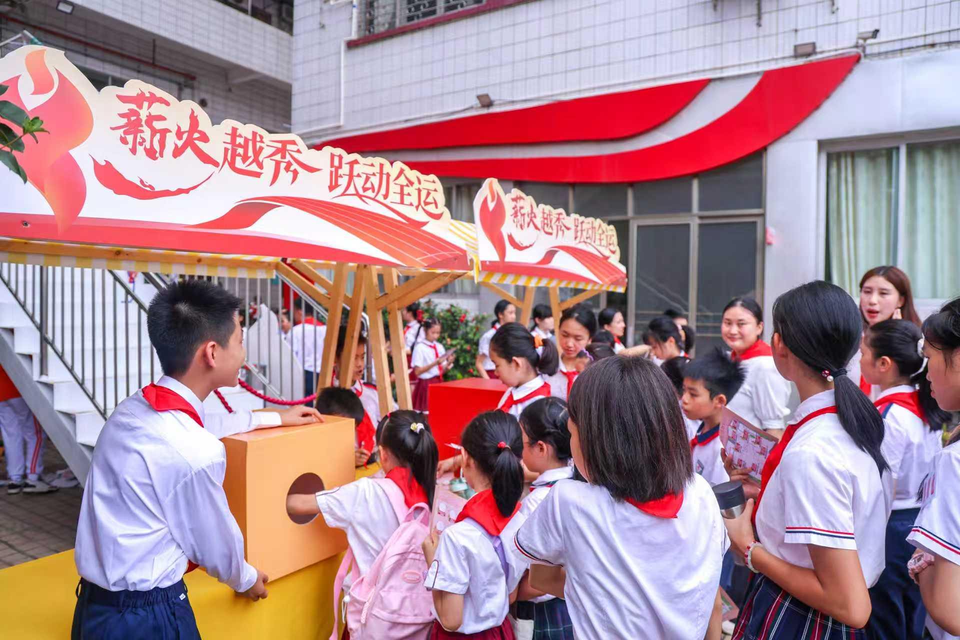 不远处的“表情包抽奖摊位”人头攒动,队员们凭借在展位互动中获取的印章换取由他们自主设计的“越秀少先队主题表情包”和明信片。这些作品将奋斗誓言与体育项目巧妙融合,或呈现身边的红色革命遗址,让红色文化与奋斗精神可感可触。