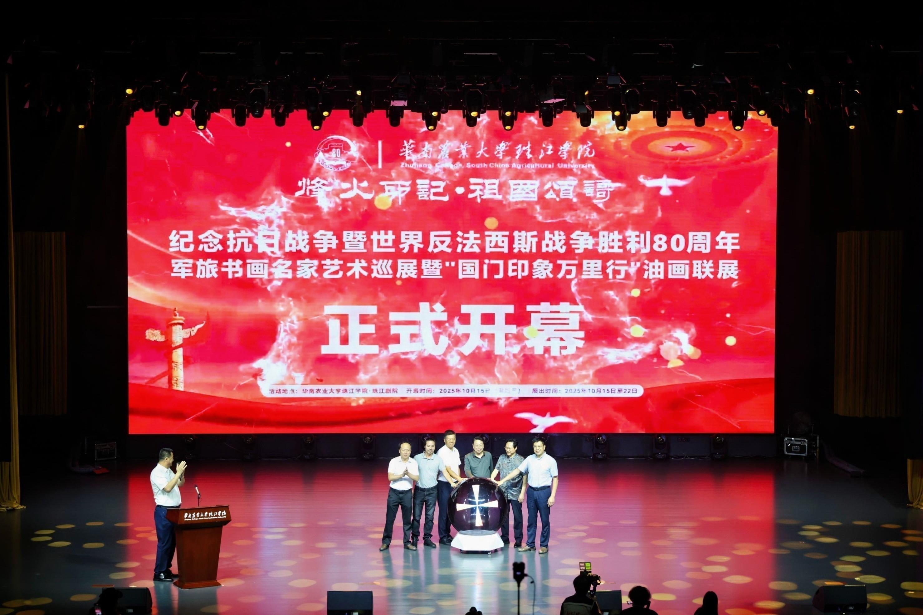 10月15日,“烽火印记·祖国颂歌——纪念抗日战争暨世界反法西斯战争胜利80周年军旅书画名家艺术巡展暨‘国门印象万里行’油画联展”在华南农业大学珠江学院(以下简称“华珠”)珠江剧院开幕。