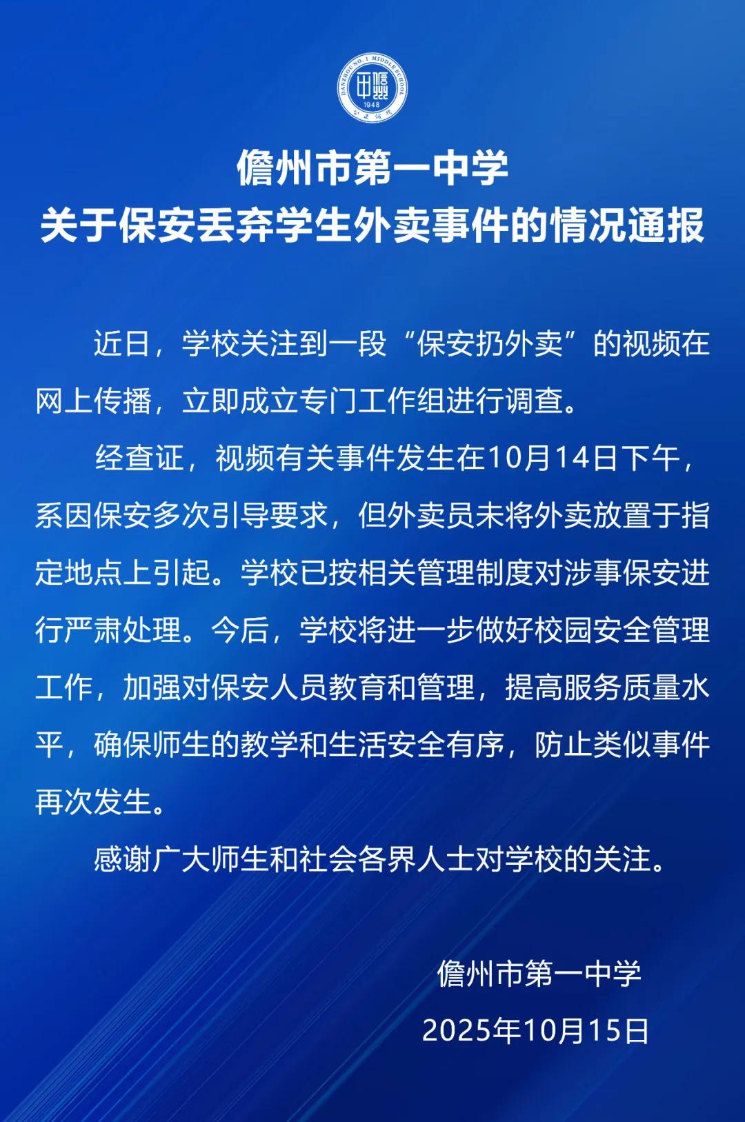 近日,有海南网友发视频称,一中学保安将校门口的外卖扔到花坛当中,引发关注。另一段视频显示,该保安将花坛中的外卖单据全都撕下,直接扔在了地上。