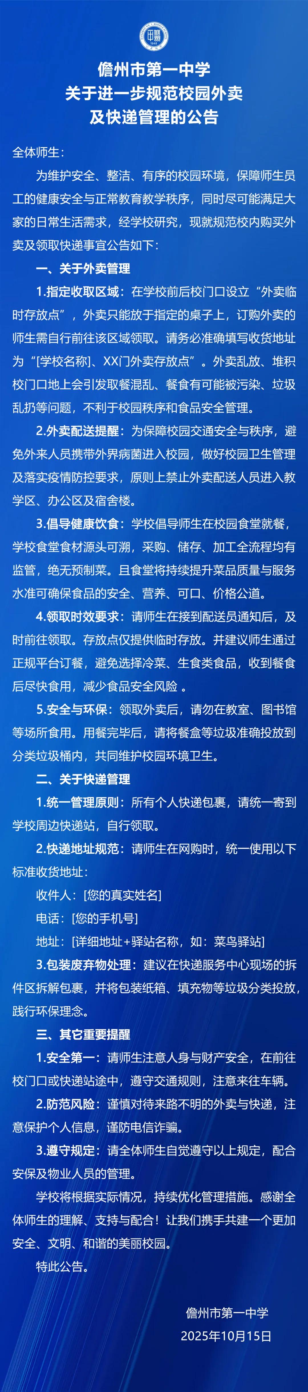 10月15日,记者联系到儋州第一中学办公室,工作人员表示已了解到此事并已向上反馈,对应的部门正在核实处理当中。“为了学生的食品安全,我们不建议外卖进入校园。”