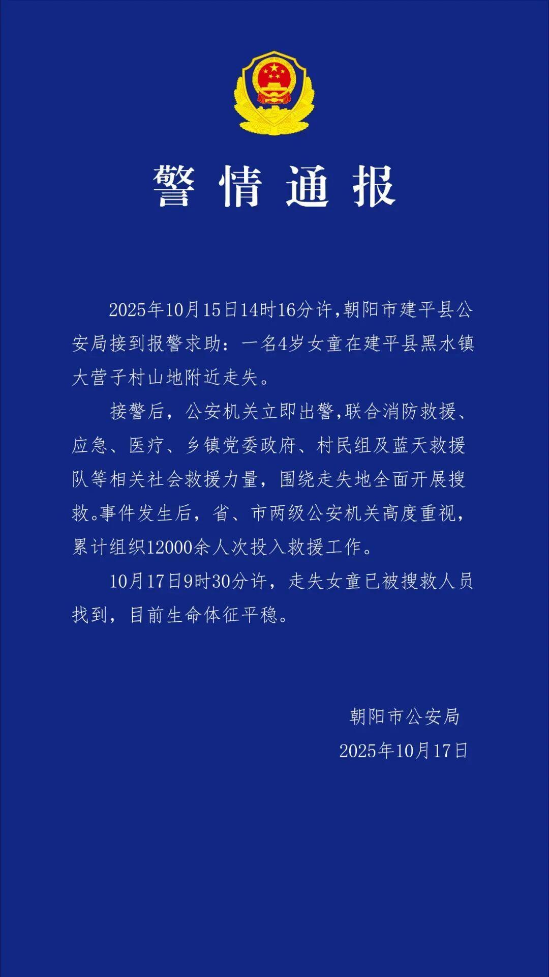 10月17日,辽宁省朝阳市公安局发布警情通报:此前在建平县黑水镇大营子村山地附近走失的4岁女童已被搜救人员找到,目前生命体征平稳。