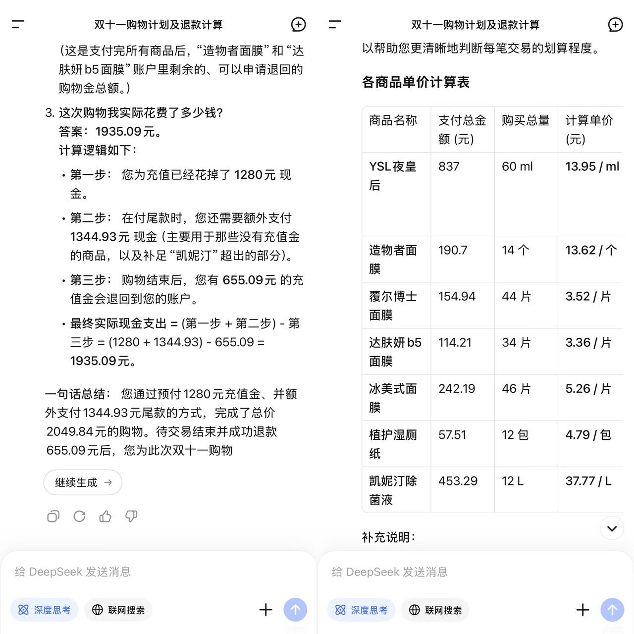 在去年双十一和今年618购物节,宛盈都没有想过借助AI来购物。“这次双十一突发奇想,用AI计算下来,觉得还是挺有趣的。”她说,未来购物还会继续尝试,“比如,要对比不同平台的价格时,把AI作为比价工具。”