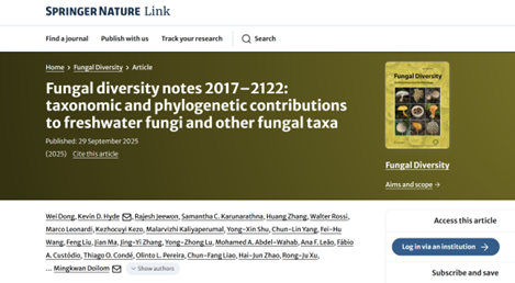 《Fungal Diversity》以发表具有重大突破性的分类学、系统发育和多样性研究成果而闻名。本研究聚焦淡水真菌及其他类群,通过多基因系统发育分析结合形态学特征,对真菌分类体系作出了重要补充和重大修订,为全球真菌资源认知和系统演化研究提供了来自仲恺学者的关键数据。