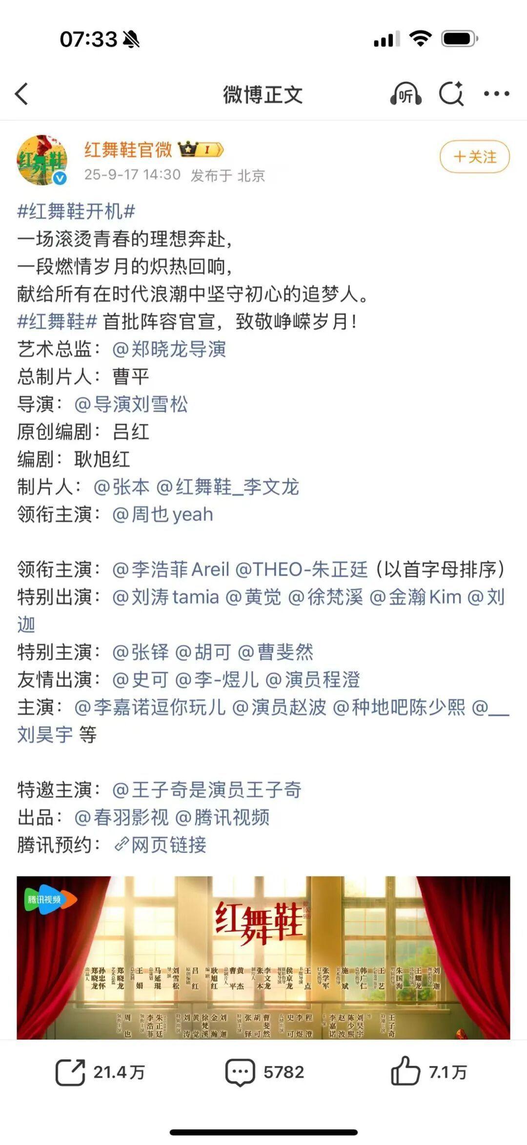 公开信息显示,《红舞鞋》是由春羽影视、腾讯视频出品,郑晓龙担任艺术总监,曹平担任总制片人,刘雪松执导,吕红原创编剧,耿旭红编剧,周也等主演。