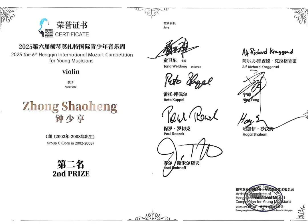 在横琴莫扎特音乐周之前,钟少亨的“战场”就早已不止于校园。西贝柳斯国际小提琴比赛、海菲兹国际小提琴比赛、意大利克雷蒙纳国际小提琴比赛……这些赛事里,他曾多次与成年选手同台,也慢慢磨出了“不怯场”的心态:“第一次跟大人比会紧张,但比多了就明白,评委看的不是年龄,是你拉得好不好。”