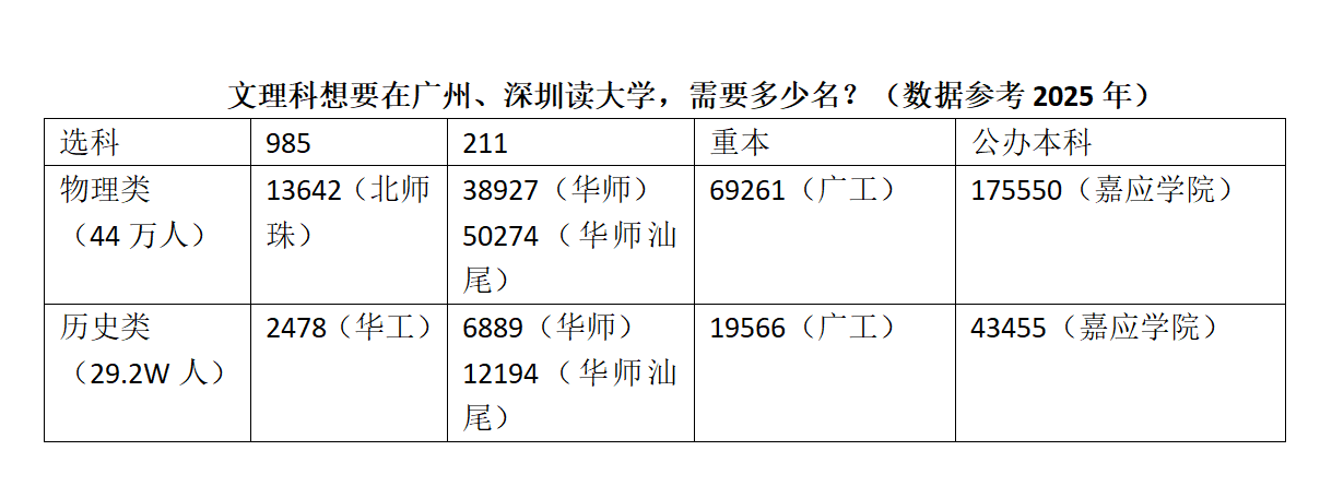 如果目标不仅仅是读大学,而是想在好一些的城市读好一些的大学,以珠三角城市为例,985高校中录取分数最低的北京师范大学海珠校区物理类全省录取到13642名;华南理工大学历史类全省最低录取排名为2478名;211大学方面,华南师范大学物理类全省录取到38927名、物理类最低录取到6889名;广东工业大学历史类最低排名物理类69261名、历史类19566名;公办本科的嘉应学院最低录取排名物理类175550名、历史类43455名。