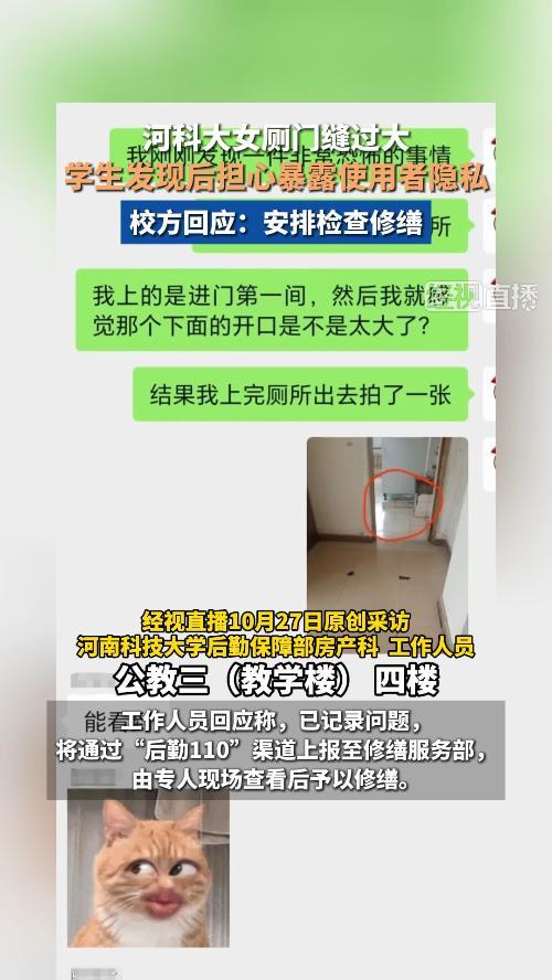 记者致电河南科技大学后勤保障部房产科,工作人员回应称,已记录“公教3教学楼4楼女厕门底缝隙过大”的问题,将通过“后勤110”渠道上报至修缮服务部,由专人现场查看后予以修缮。