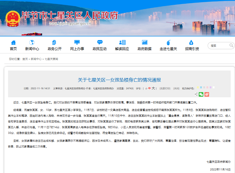 2022年11月11日,毕节七星关区某小学女生张某某因被当地某文具店店主怀疑偷窃商品,从自家楼顶坠楼,事件引发网友广泛关注。