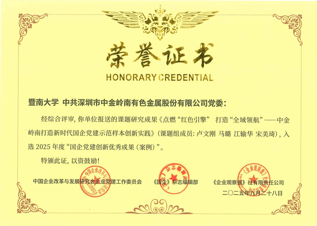 论坛还举行了第六届国企党建创新优秀成果(案例)“2025年度国企党建创新优秀案例”证书颁发仪式。由广东省高校新型智库——暨南大学湾区国际智慧应急与安全发展研究院院长、党的建设与公共安全治理研究院院长卢文刚,与广晟集团控股的上市公司中金岭南联合申报的案例《点燃“红色引擎” 打造“全域领航”——中金岭南打造新时代国企党建示范样本创新实践》,从全国1500多个案例中脱颖而出,入选2025年度“国企党建创新优秀成果(案例)”。