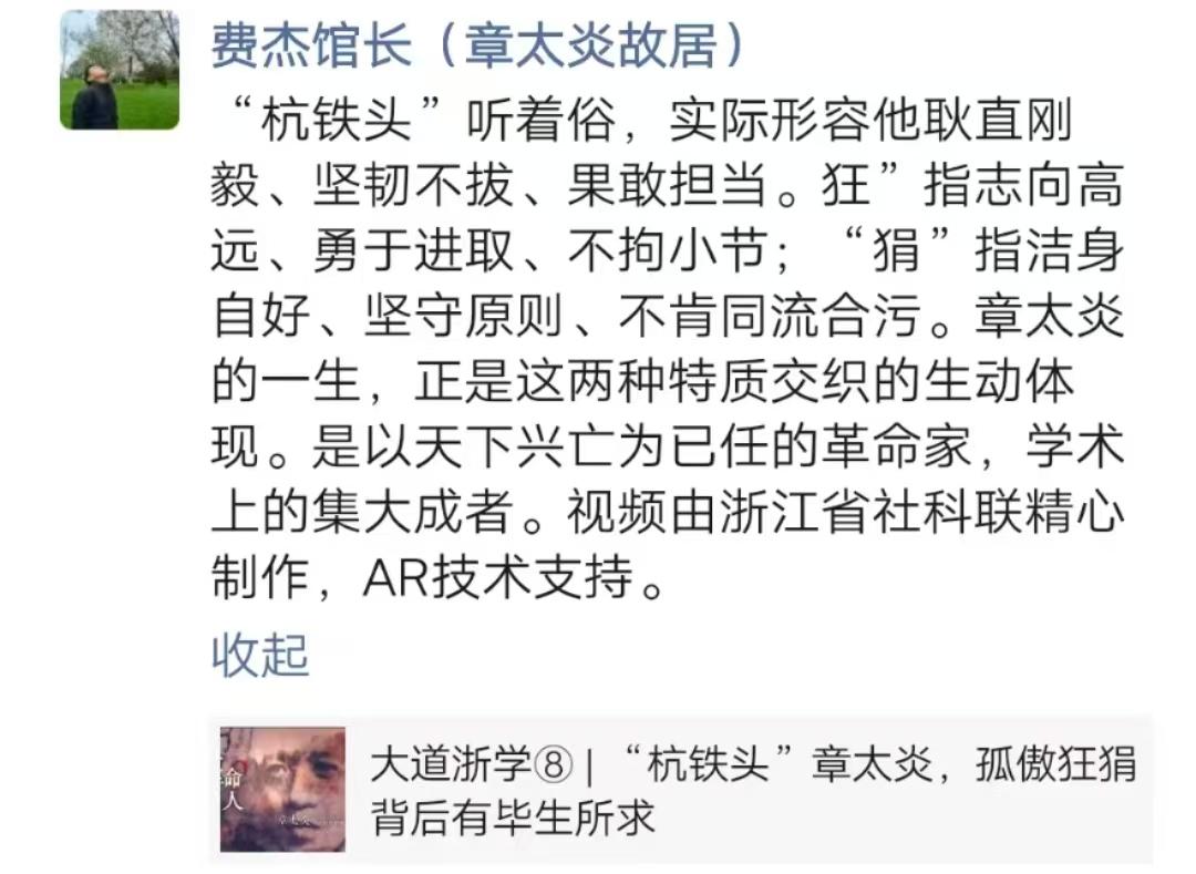 “大道浙学”系列的第七位大师“杭铁头”章太炎篇发布后,章太炎故居的费杰馆长很快转发点赞,并进一步补充解读章太炎的“狂狷”:“狂”指志向高远、勇于进取、不拘小节;“狷”指洁身自好、坚守原则、不肯同流合污。章太炎的一生,正是这两种特质交织的生动体现。是以天下兴亡为已任的革命家,学术上的集大成者。