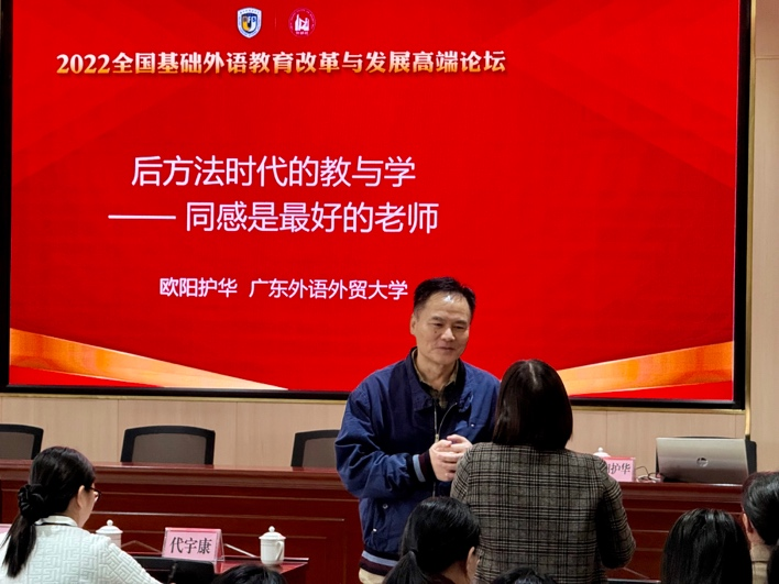 随后,广东外语外贸大学博士生导师欧阳护华教授以《后方法时代的教与学:同感是最好的老师》为题,从教育哲学与课堂实践的双重视角,阐释如何在教学中构建师生“同感”场域,唤醒学生主体意识,实现从“教得好”到“学得进”的课堂转型。