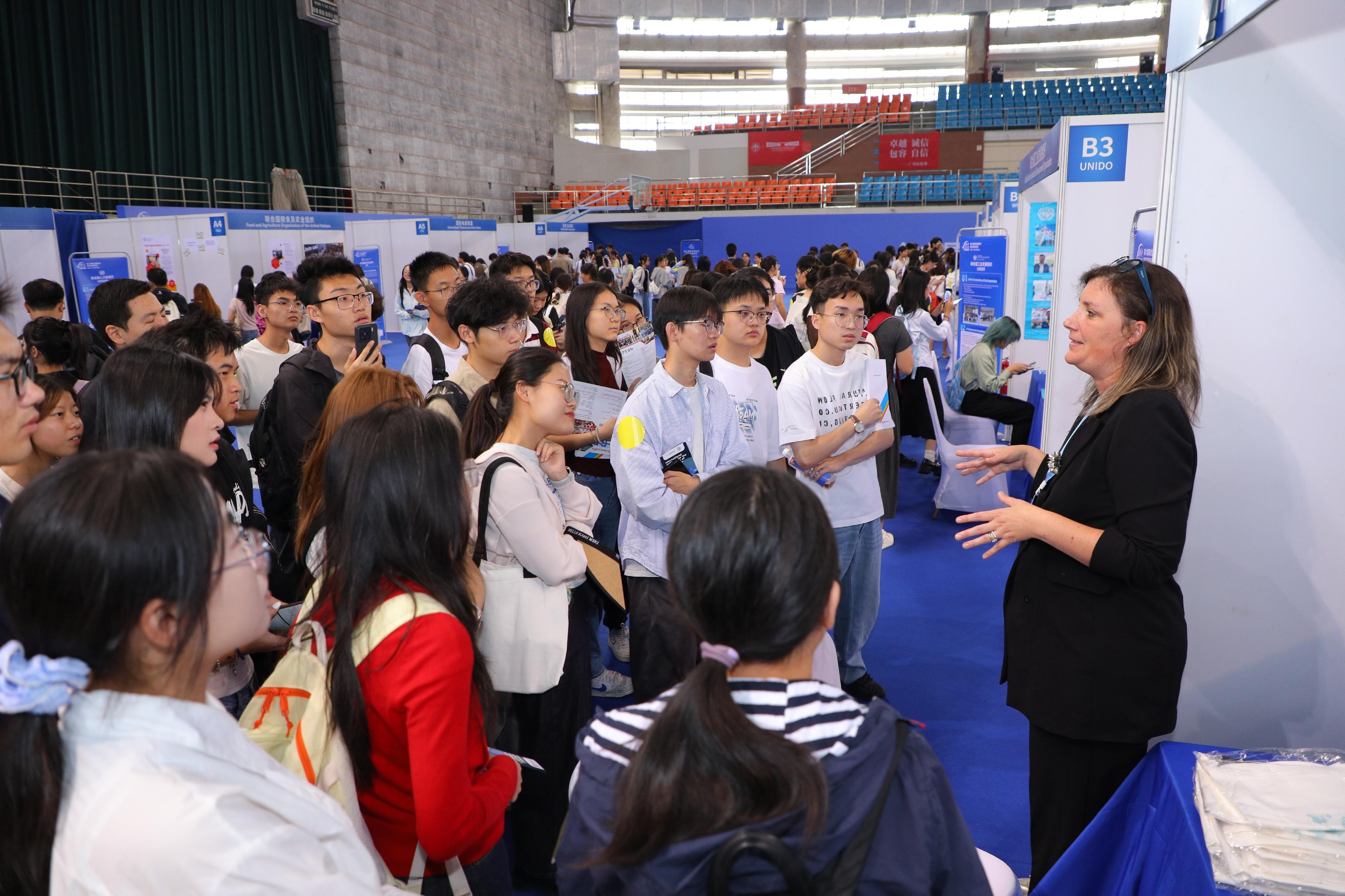 其间,24家联合国机构设立咨询展位,吸引省内外47所院校师生参与。师生们通过咨询获取国际事务动态、职业发展建议,为未来对接国际资源搭建桥梁。与此同时,各国际组织代表在语心报告厅、德馨楼课室开展宣讲,详细介绍机构愿景、组织架构和人才招聘计划,现场师生积极交流互动。