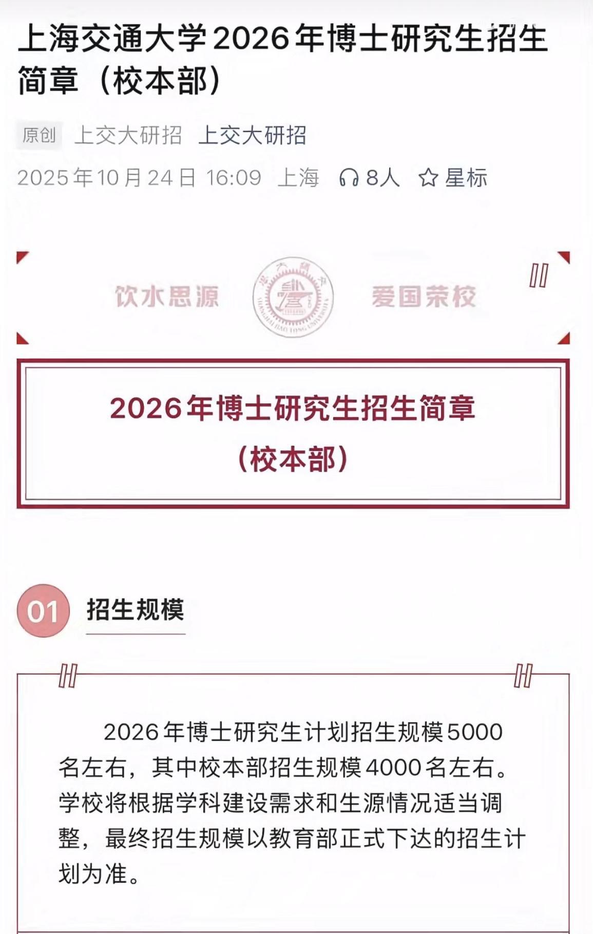 近日,上海交通大学发布2026年博士研究生招生简章,简章显示2026年博士研究生计划招生规模5000名左右,其中校本部招生规模4000名左右。学校将根据学科建设需求和生源情况适当调整,最终招生规模以教育部正式下达的招生计划为准。