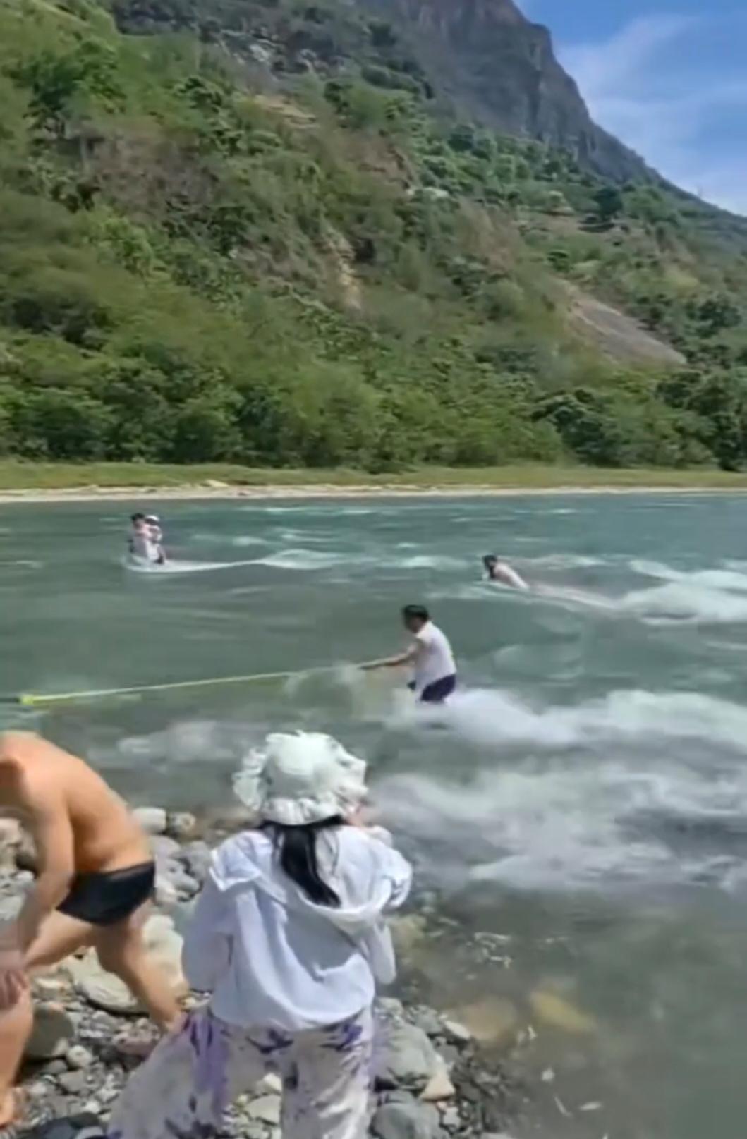 夏华选择从上游较为平缓的水域横渡河道,凭借在部队练就的过硬身体素质和游泳技能,奋力游向被困父女,五米、十米……江水冲击力远超预期,暗流中的碎石树枝划伤其臂膀,呛水的窒息感不断袭来,每划一次水都十分艰难。夏华咬紧牙关,将自己化作“身体锚点”,奋力将绳子缠在被困男子身上,为后续救援架设起“救援索道”,而他却被激流几次冲入水底。岸上人员迅速将救生圈顺着绳子滑到被困父女旁,合力把被困父女和绳子另一端的夏华拉上岸,被困父女成功获救。