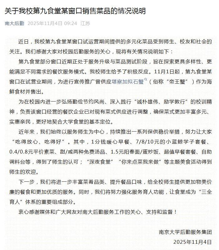 南京大学表示,11月1日起,第九食堂某窗口在试营业期间,为进行宣传推广曾供应堪察加拟石蟹(俗称“帝王蟹”)作为海鲜食材并售出。为在校园内进一步弘扬勤俭节约风尚、深入践行“诚朴雄伟、励学敦行”的校训精神,负责该窗口经营的餐饮企业已对现有菜式供应进行调整,确保菜式更加丰富多元、实惠亲民,更好地契合大学食堂的基本定位。