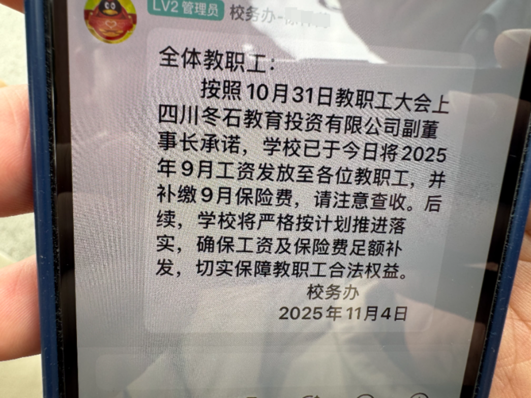 “目前老师的正常教学没有受到影响,今天上午我们已经补发第一批欠薪,后续按计划补齐余款,有信心补完。”该校肖校长接受记者采访时说,随即还展示了一份刚发下去的工作通知:学校已于今日(4日)将2025年9月工资发放至各位教职工,并补缴9月保险费。后续学校将严格按计划推进落实,确保工资及保险费足额补发,切实保障教职工合法权益。