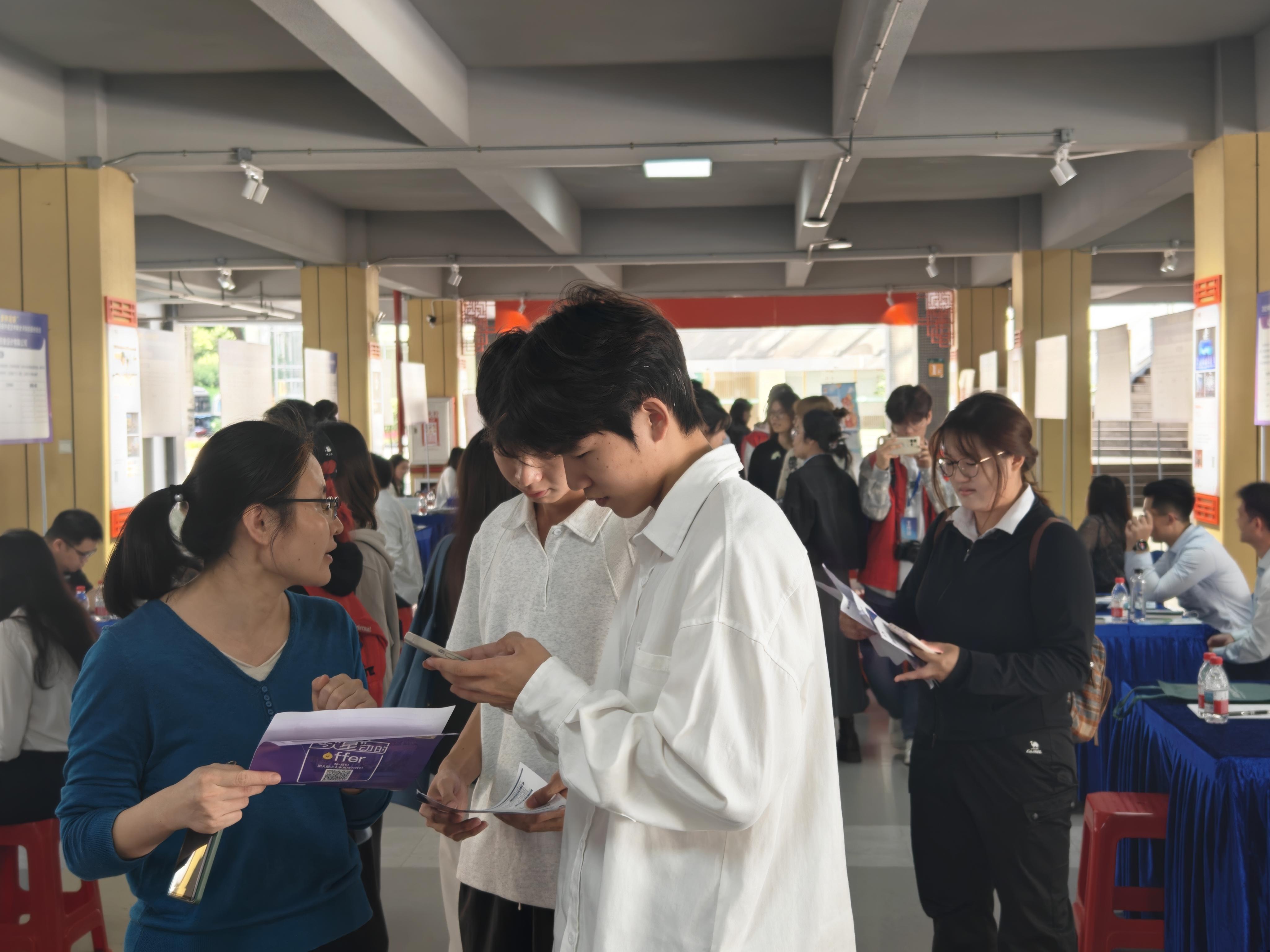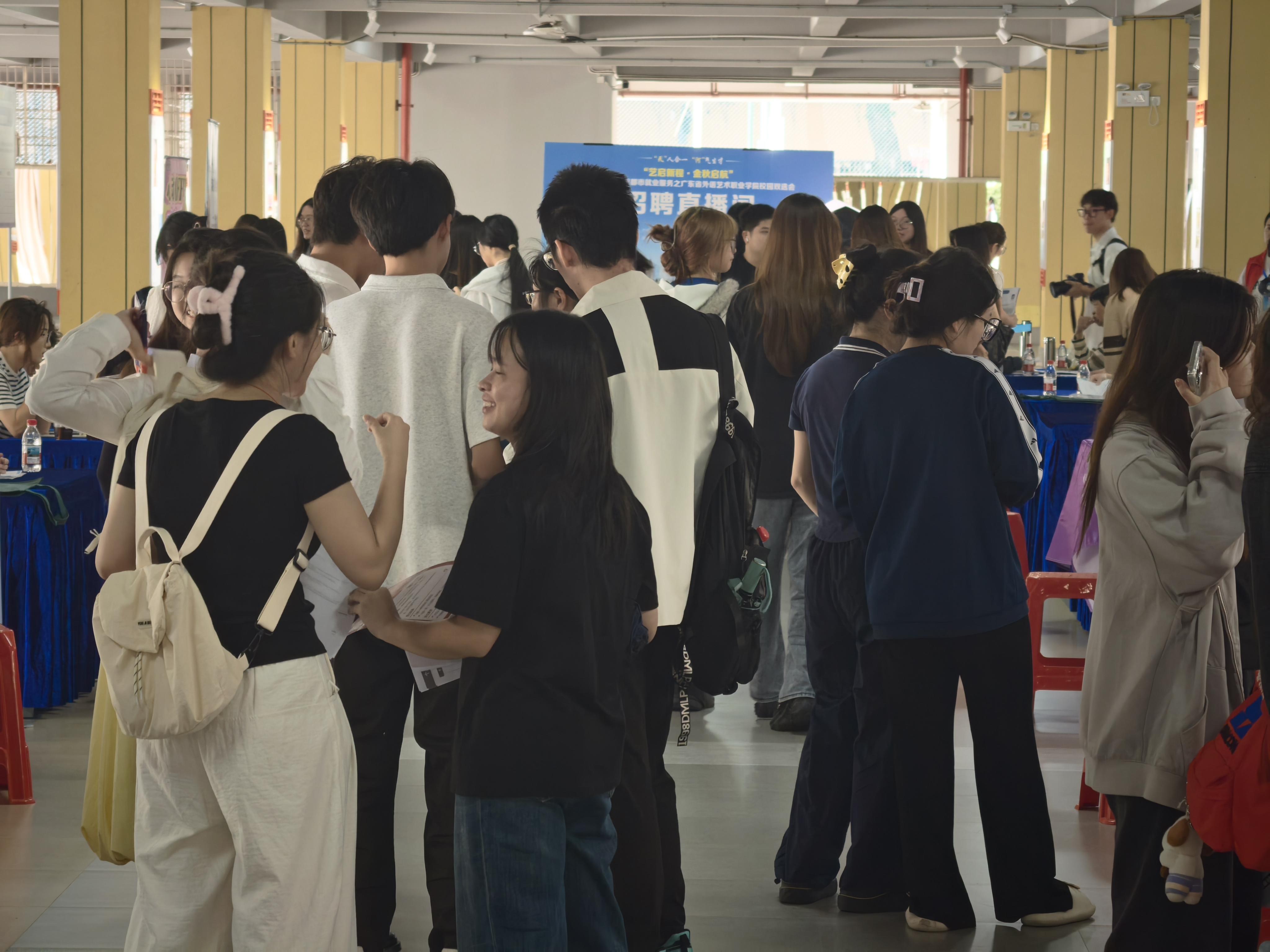 五山校区举办的“艺启新程・金秋启航”2025年校园双选会,由天河区人力资源和社会保障局与学校联合主办,吸引30余家用人单位参会,释放649个优质岗位,涵盖教育、传媒、餐饮、机电、管理等多个行业。现场特设“人才政策直通车”专区,为毕业生详解大湾区就业政策,提供“岗位投递+政策咨询”一站式服务。针对实习、地域等原因无法到场的学生,学校同步开设“云端招聘直播间”,实现线上线下双渠道协同赋能,将就业服务送到“家门口”、岗位资源送进“专业群”。