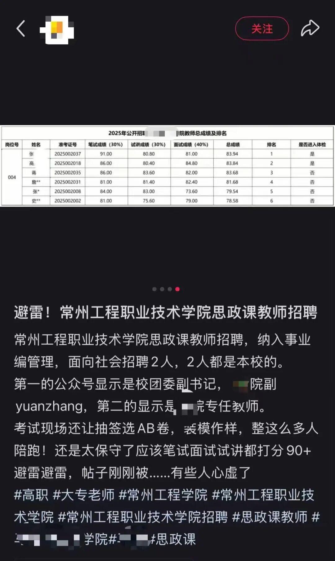 11月9日,有网友发帖称,在当日公布的常州工程职业技术学院2025年公开招聘一学院教师(第二批)总成绩中,最终进入体检阶段的张某某与高某某皆为该校老师。网友在帖中表示,“常州工程职业技术学院思政课教师招聘,纳入事业编管理,面向社会招聘2人,2人都是本校的。第一的公众号显示是校团委副书记,某学院副院长,第二的显示是某学院专任教师。”