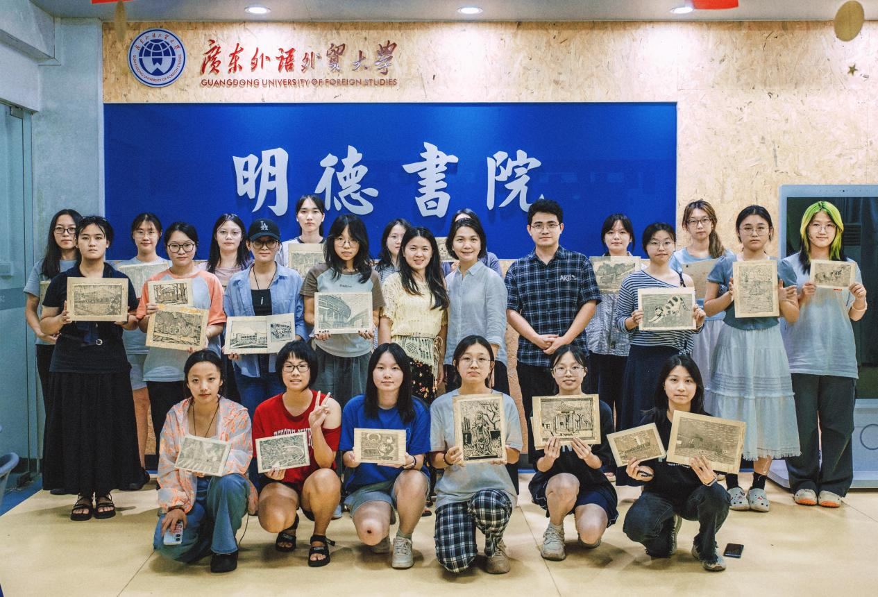 灯笼映古韵,指尖承文脉。广外师生化身“手艺人”,千年积淀的文化密码通过一场场沉浸式体验悄然流转。明德书院内墨香袅袅,广州美术学院副教授罗海英指导学子雕刻广外特色木版画,红纸覆版时的墨色氤氲里,让学生在刀刻拓印间触摸岭南文脉。