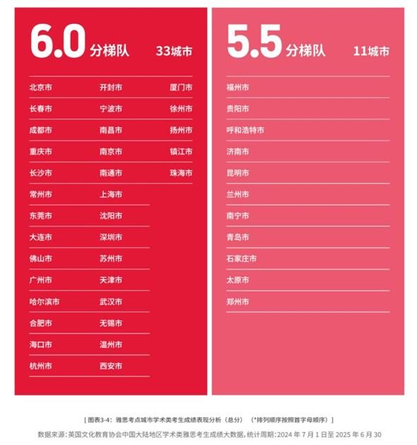 报告显示,2024-2025年度,持中国大陆护照的学术类雅思考生平均成绩为5.9分,在全球参与排名的国家和地区中位列第35位。从省份看,广东省进入6.0分梯队;从城市看,广州市、深圳市、珠海市、东莞市、佛山市进入6.0分梯队。均位列全国前茅。